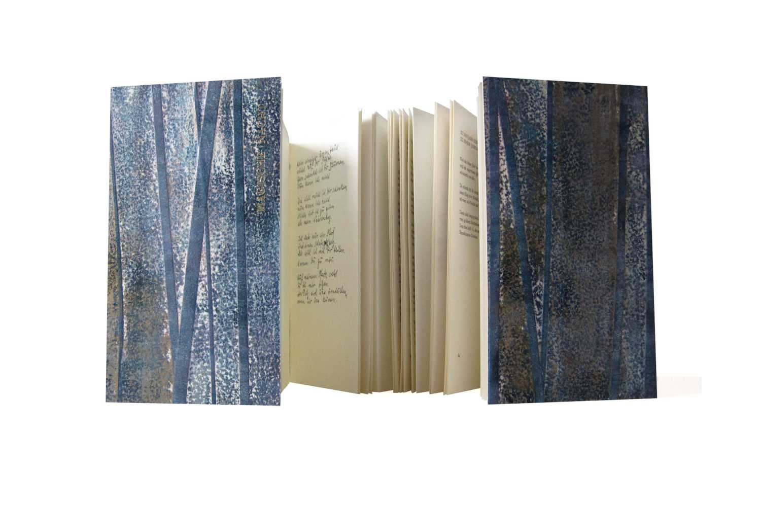 Halblederband, handgefertigte Bezugspapiere, 3-seitiger Farbschnitt, Kassette. Format: 13,5 x 18,5 cm; 2021